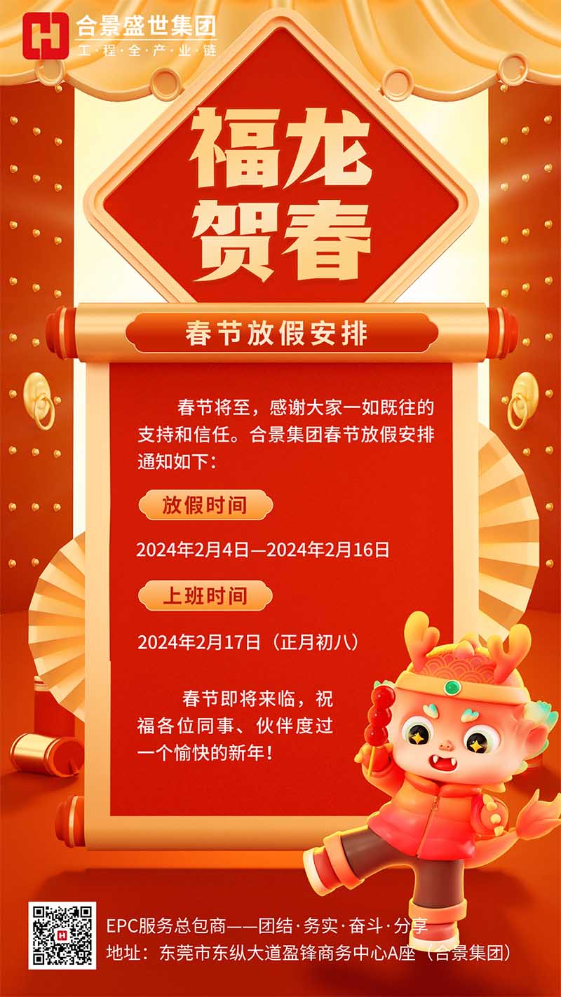 龍年行大運,喜迎新篇章。2024年新春佳節(jié)將至,根據(jù)國家節(jié)假日放假規(guī)定,結(jié)合我司實際情況,決定2024年春節(jié)放假安排如下: